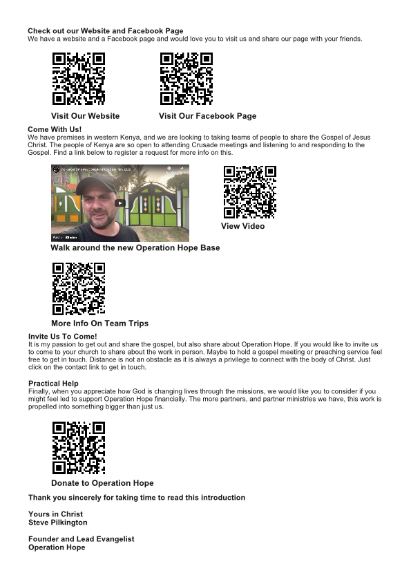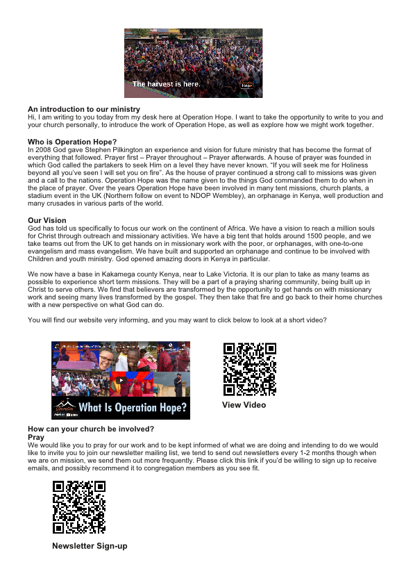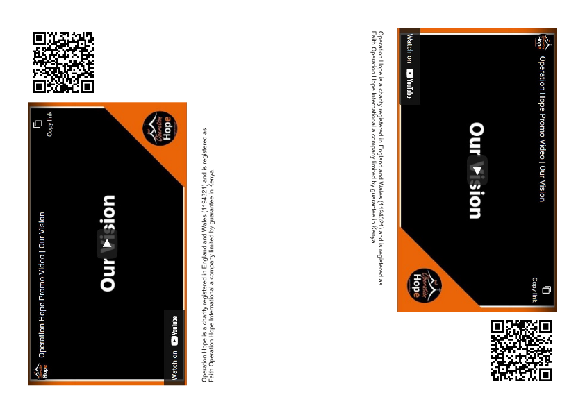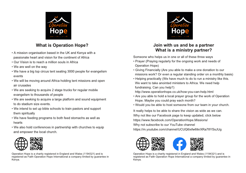 We are developing downloadable printable material publicising the work of Operation Hope. We are designing A4 posters, A5/A6 flyers/leaflets for churches and christian organisations to use in leaflet dispensers and other places where information is available for visitors. Each of these leaflets has QR codes to enable you to readily access further information online.